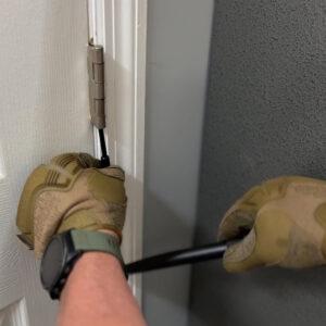 A key feature of the Jimmy Pry Tool is the integrated, removable hinge pin punch, allowing operators to efficiently remove hinge pins on pull doors. Once pins are removed, the tool can be used to pry doors or create initial gaps that allow larger breaching tools, such as Halligan bars, to be brought into play.