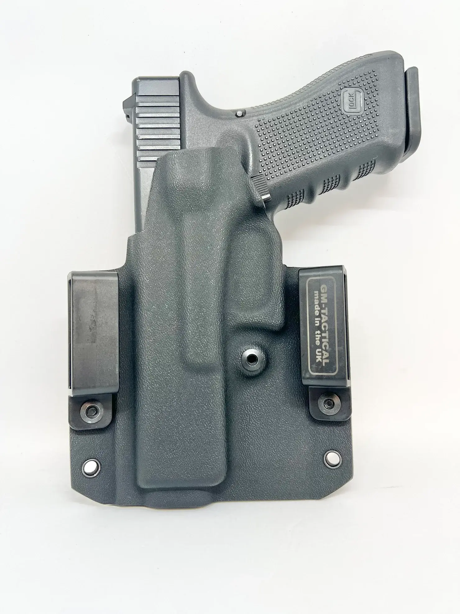 The GM-Tactical Outside the Waistband (OWB) Kydex Holster for the glock 17 is designed to provide full-length protection from the ejection port to the muzzle, with a small opening at the bottom to allow for proper drainage. Its precision-moulded construction includes an angled cut for a smooth, fast, and safe draw, supporting confident weapon handling under pressure.