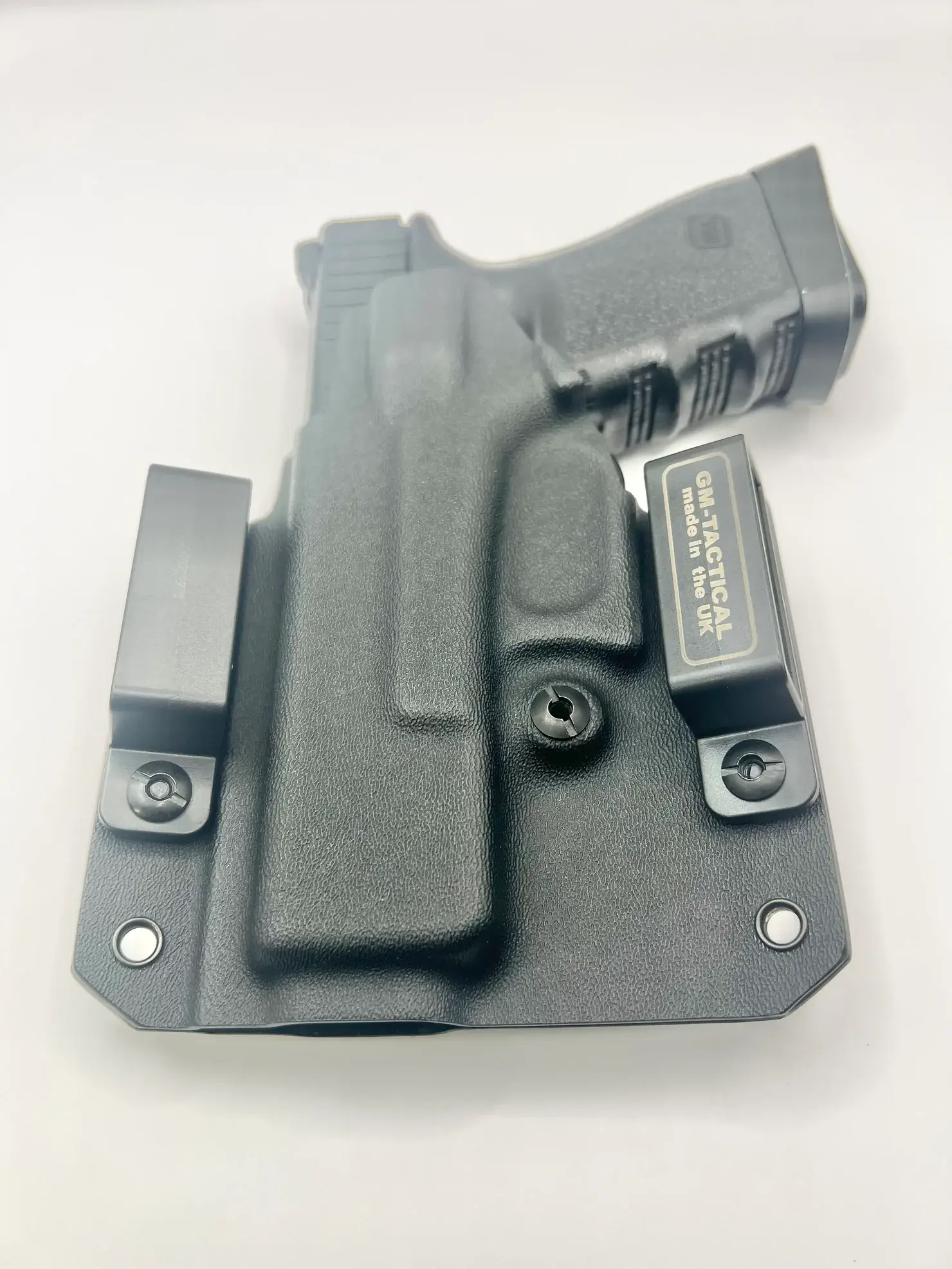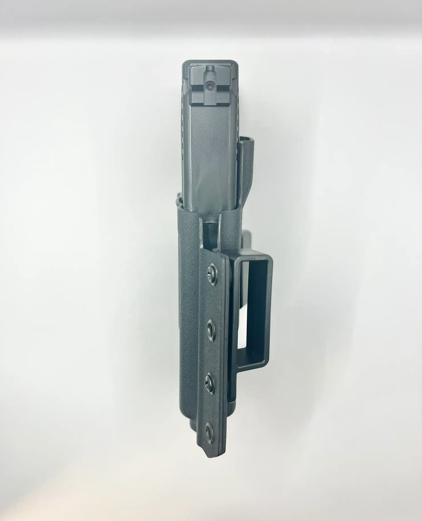 The GM-Tactical out sode the waistband (OWB) Kydex Holster for the Glock 19 is designed to provide full-length protection from the ejection port to the muzzle, with a small opening at the bottom to allow for proper drainage. Its precision-moulded construction includes an angled cut for a smooth, fast, and safe draw, supporting confident weapon handling under pressure.