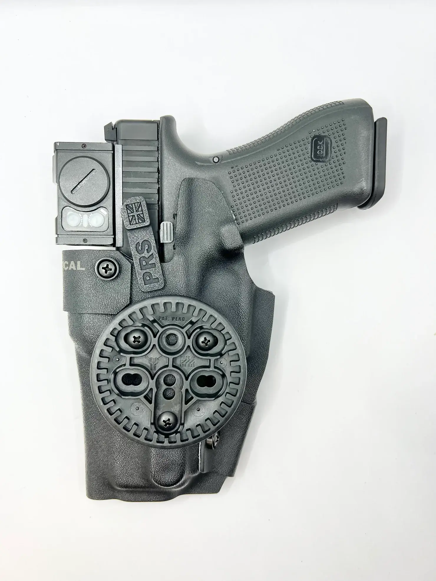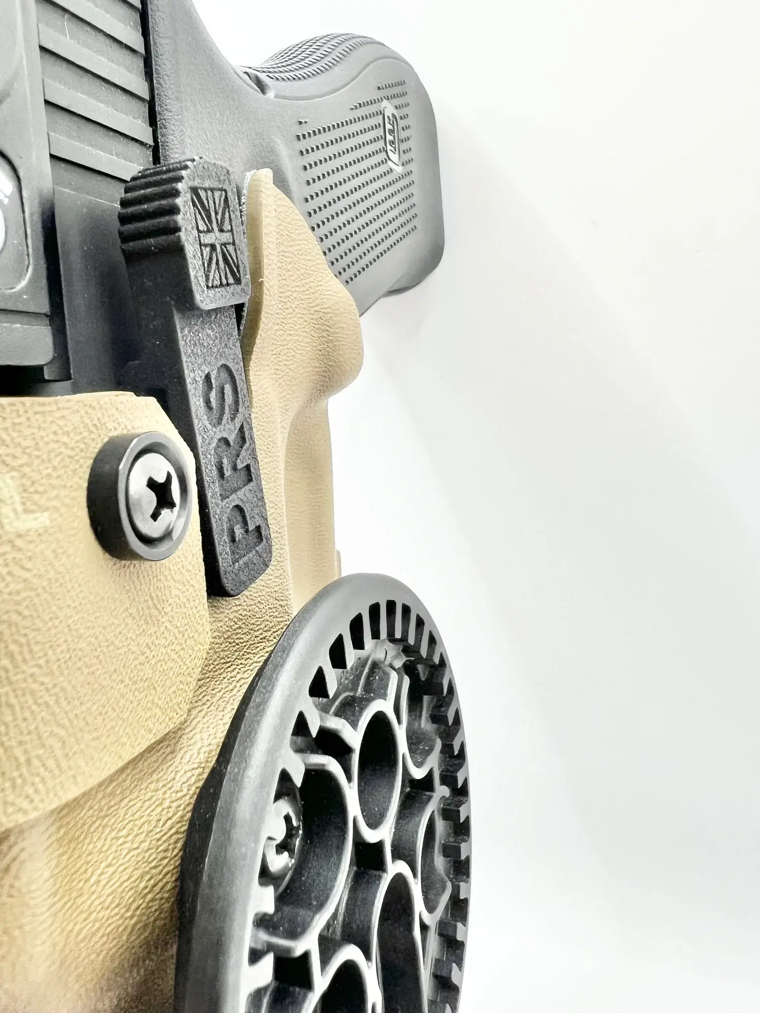 At the core of the system is the LVL2 “PRS” retention unit, a thumb-activated depress switch that automatically locks the weapon in place when holstered. The mechanism is positioned low and wide to allow a more natural, positive firing grip during deactivation, supporting a smooth and efficient draw under pressure.