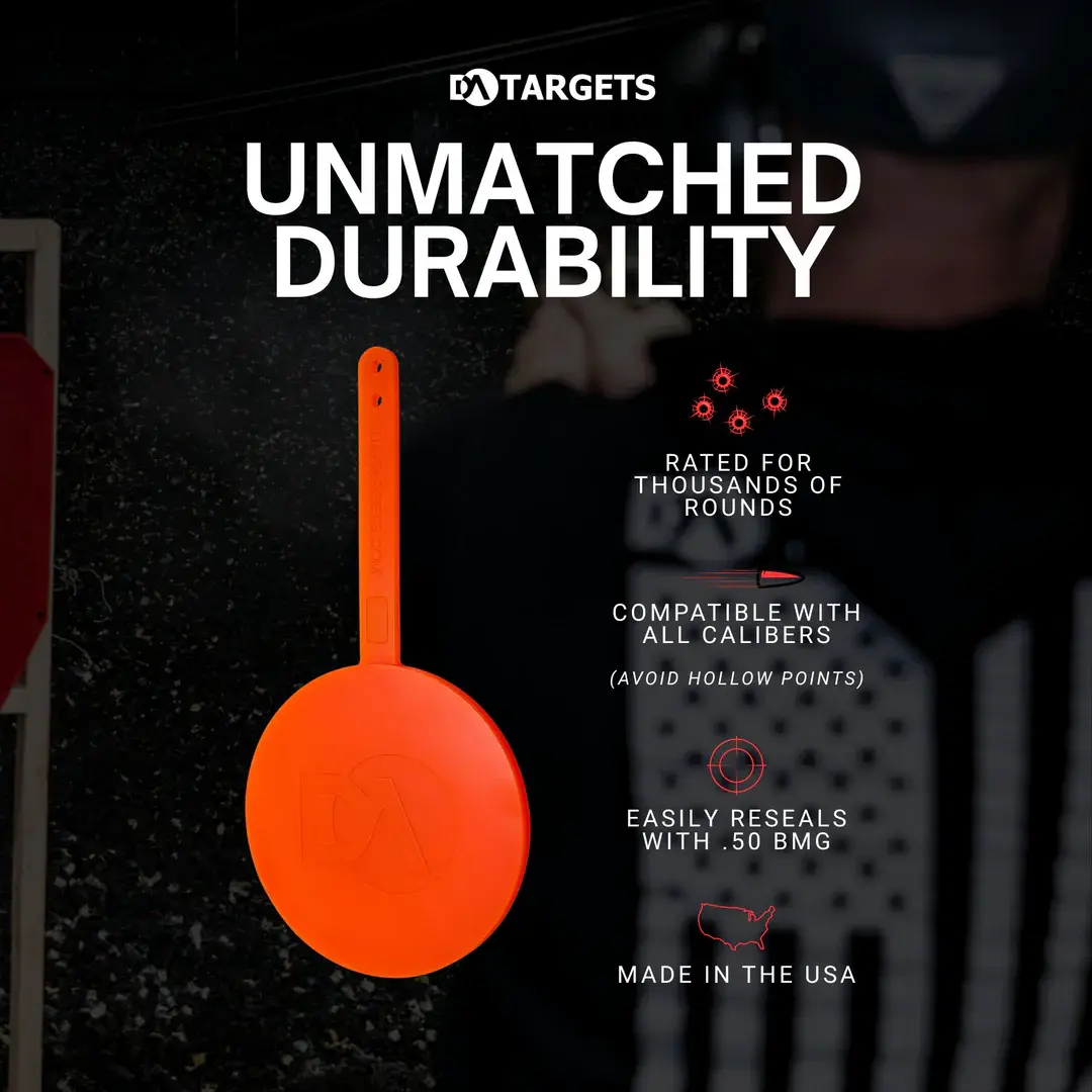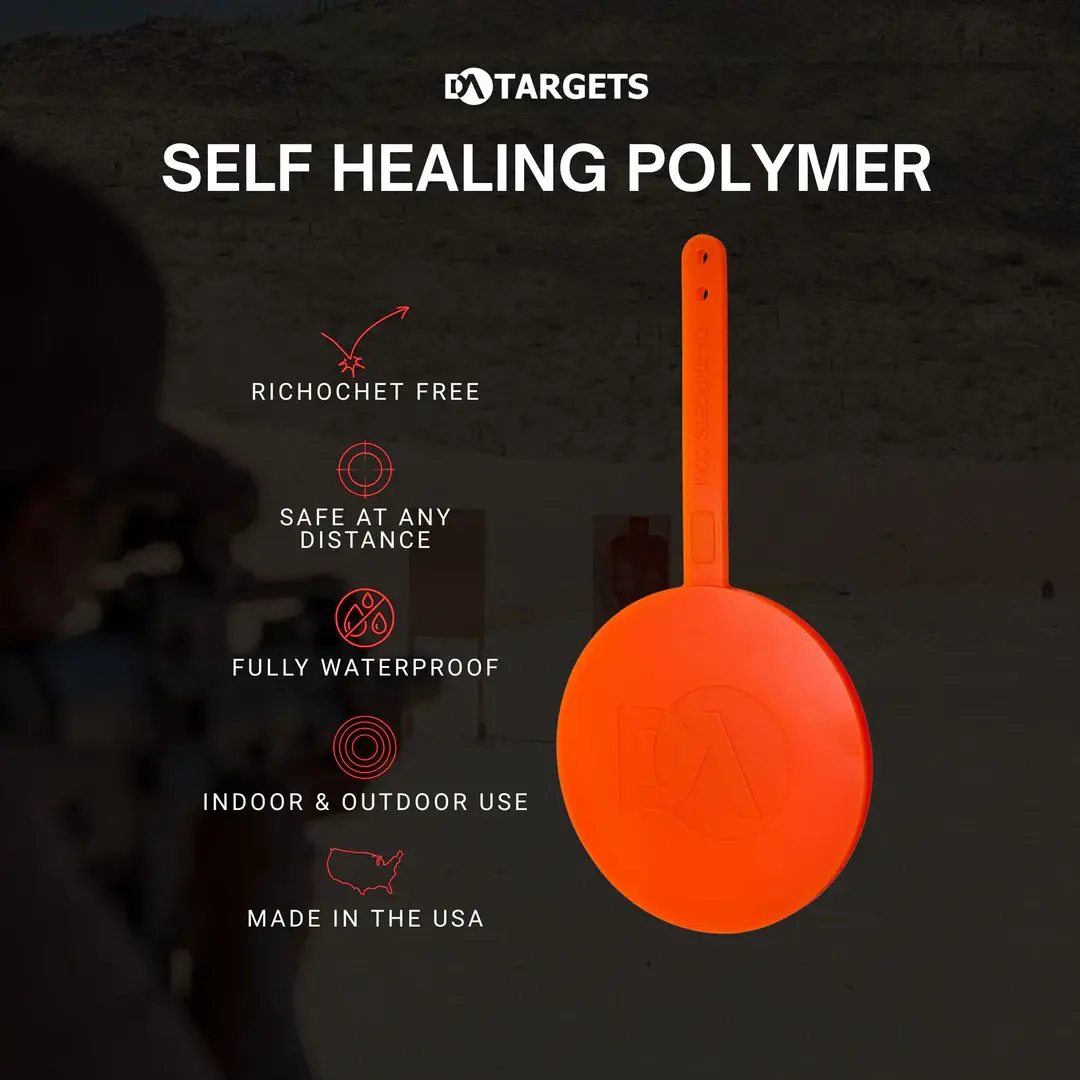 The DA Targets 6 Inch Gong Non Color Changing Target provides a durable, reactive training option in a simple gong style format. Built from advanced self healing polymer, the target instantly seals bullet holes upon impact as projectiles pass safely through the material. This design significantly reduces wear, extends service life, and eliminates the danger of ricochets or splash back of bullet fragments.