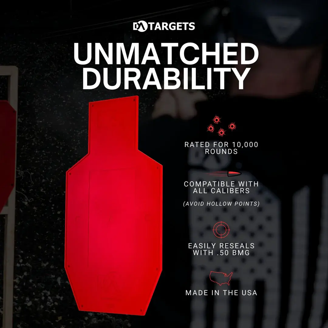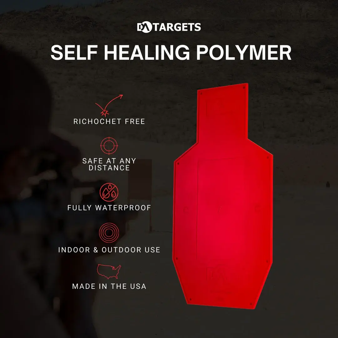 The DA Targets C Zone Silhouette Colour Changing Target is a regulation size training target designed to provide instant visual feedback, long service life, and a safer shooting experience across a wide range of environments. Built using advanced self healing polymer technology, the target automatically seals bullet holes upon impact, significantly reducing wear while eliminating the risk of ricochets and splash back.